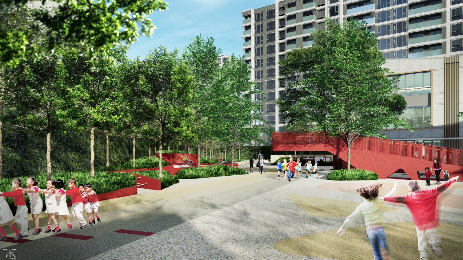 Towards the southern side of the site is the Kids & Sub Entrance Zone, where a kindergarten locates. The design idea is to let the atmosphere of the Forest Zone sprawl into this area, in order to create a comfortable environment for this zone. Red and warm color tone has been used in this zone to symbolize the energetic atmosphere of children, while all elements, such as paving, seating, and play equipment are designed in triangular form to reach consistency with the overall design concept. Colorful running lane and a running bridge have been provided within the kindergarten to encourage outdoor exercise. Moreover, planting scheme in this zone will be colorful with flowering species to brighten up the playful atmosphere of the landscape.