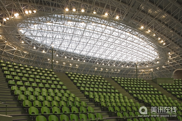 外墻可調節室內環境 屋頂和墻壁的連續面被植被和人工土壤覆蓋,土壤中摻有由日本柳杉皮和柏樹皮。帶有10多種植物種子的土壤灑在各斜面上,斜面的最大角度為70度。開始的時候,僅僅只是一些黑色土壤。半年后,土壤中的植物開始生長了。在建筑的南面,植物最高覆蓋到20米的高處。北面因為直射光較少,植物最高只到4米處。這樣的植被溫室所引起的隔離效果很明顯。在最熱的夏季,體育館外溫度達到40度的時候,體育館內大約才30度。一般來說,大型室內場所即使在白天也需要人工照明。在這里,則通過3個大型的天窗來減少人工照明光線的能量消耗,以保證室內所需的照明度。天窗的玻璃上貼有遮蔭層,用來減少太陽直接照射所提高的溫度,另外,安裝的天窗孔可進行重力通風。