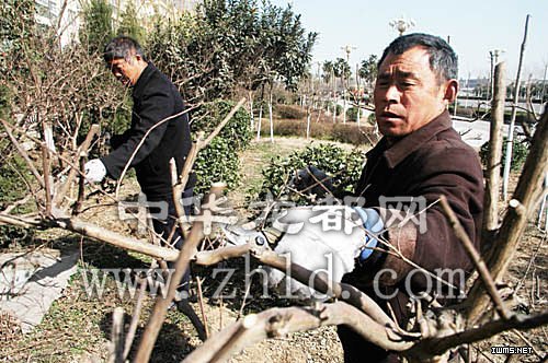 3月2日,在河南周口市區(qū)太昊路上,幾名園林工人修剪路兩旁綠化帶內(nèi)的百日紅。近日,氣溫不斷升高,園林工人開(kāi)始修剪市區(qū)道路兩旁的花木,使其長(zhǎng)出的枝更繁茂、開(kāi)出的花朵更艷麗。 楊正華攝