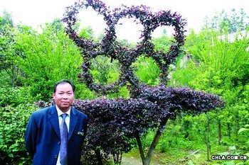 記者看到,周生家門口的小樹林子里,還有很多被精心嫁接、修剪成不同形狀的樹,如茶花樹嫁接的柚子樹、被修剪成龍鳳形狀的紅檵木等。