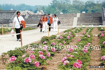 “五一”前夕,中國牡丹之鄉山東菏澤花農桑希山向圓明園捐贈的牡丹已有十余萬株盛開,為節日的北京增添了喜慶吉祥的氣氛。圓明園迎來了象征著“太平盛世”的“鏤月開云”勝景。