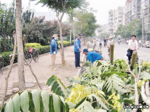 今年以來,河西區實施的迎奧運綠化提升改造工程使城區面貌大為改觀,6月23日的雷陣雨過后,河西園林工人抓緊修剪道路沿線樹,以保持綠化效果。