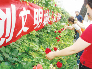 社區書記問她是什么原因讓她產生了“用鮮花裝點城市”的想法,她指著社區門前的一個“創建文明城市人人有責”的條幅說:“就是因為這個條幅,我看了之后就有了想法,可我也不知道該怎么做貢獻,所以就想了這個法子。用鮮花把馬路裝扮起來,路邊的行人、車上的乘客、游客看到這些花都會感覺很舒服的。”