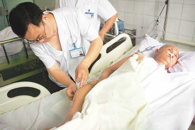 6月20日,四川省遂寧市一位醫(yī)護人員對汶川特大地震災區(qū)送來的傷員進行治療。