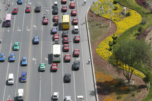 7月8日上午,車輛在庫爾勒市街頭的花叢旁行駛。截至當日,庫爾勒市園林局在市區(qū)街道上已擺放了72萬多株鮮花,為“綠色奧運”營造氛圍。庫爾勒市園林局計劃8月8日前完成在街頭擺放80萬多株鮮花的任務。