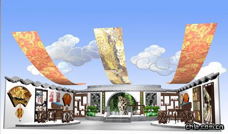 江蘇展區面積90平方,是面積最大的“小屋”之一。“小屋”劃分為演出區、展示區和手工藝表演活動區三大功能區。四周為粉墻黛瓦,中為園門。門后透綠,植芭蕉、翠造景。前為臺,演員現場演出昆曲。臺前砌一曲池,架一紅色木拱橋與觀眾隔開,池中有蓮花燈、五色錦鯉、雨花石,高低錯落數枝蓮花、荷葉等。“小屋”內現場展示了云錦、蘇繡、緙絲、紫砂、堆花、揚州漆器、玉器、明式家具、桃花塢年畫等江蘇特色工藝精品近200件,總價值超過500萬。