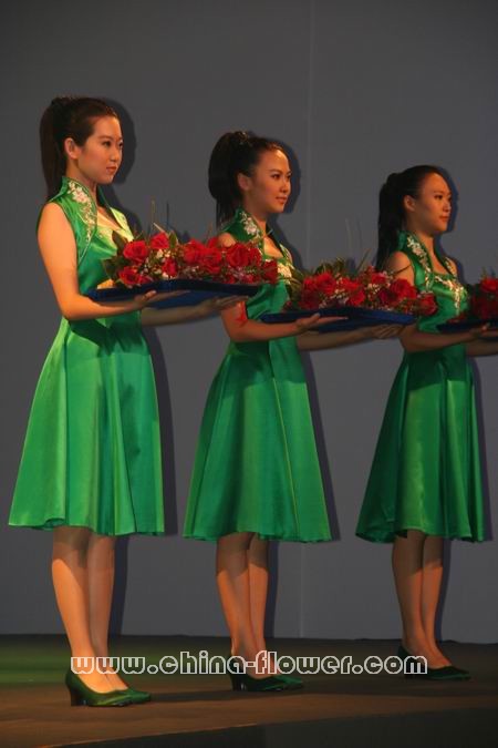 奧運頒獎手捧花昨日在“北京2008年奧運會頒獎禮儀服飾及主要頒獎元素發布會”上首次亮相。此次名為“紅紅火火”的奧運手捧花以月季和火龍珠、假龍頭、書帶、玉簪和芒葉等為主花材!爸袊t”為主基調,象征中華民族自強不息,團結一心的民族精神和不斷追求友誼、團結、公平競爭的奧林匹克運動精神。 下面組圖為發布會現場禮儀小姐手捧奧運頒獎手捧花。