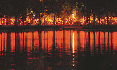 7月23日晚,通州運河文化廣場上的“奧運項目”主題彩燈與水中的倒影交相輝映。