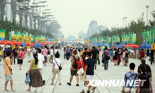 8月17日,人們在奧林匹克公園景觀大道游覽。當日,4萬觀眾來到北京奧林匹克公園游覽。占地1000多公頃的北京奧林匹克公園包括奧林匹克森林公園、景觀大道、國家體育館、國家體育場、國家游泳中心和運動員村等設施。 新華社記者 張燕輝攝