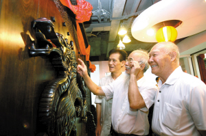 悠悠古琴,清茶飄香。1500平方米的鑒賞大廳四處放著古木制品,讓參觀者大飽眼福。記者在該協會進門處看到,一扇名為“泰山北斗”的古木屏風,以古木的歷史久遠和制作手法的精細引起業內人士關注。屏風的正面雕有一只欲騰空飛翔的“三爪龍”,背面刻有“日出東方”的泰山圖,整個屏風長8米,高3米。