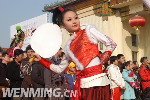2月9日下午,中國非物質文化遺產傳統技藝大展開幕式在全國農業展覽館舉行。圖為開幕式上的太平鼓表演。 中國文明網 王嘯 攝