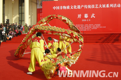 2月9日下午,中國非物質文化遺產傳統技藝大展開幕式在全國農業展覽館舉行。圖為開幕式前的舞龍表演。 中國文明網 李錦云 攝