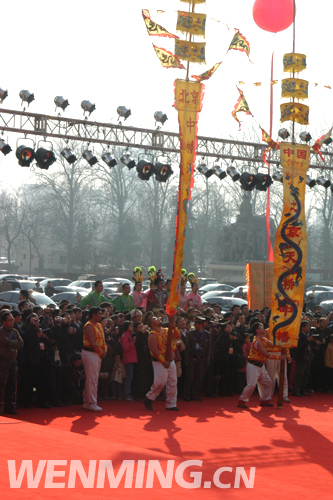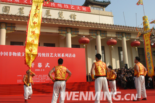 2月9日下午,中國非物質文化遺產傳統技藝大展開幕式在全國農業展覽館舉行。圖為開幕式上的中幡表演。 中國文明網 王嘯 攝