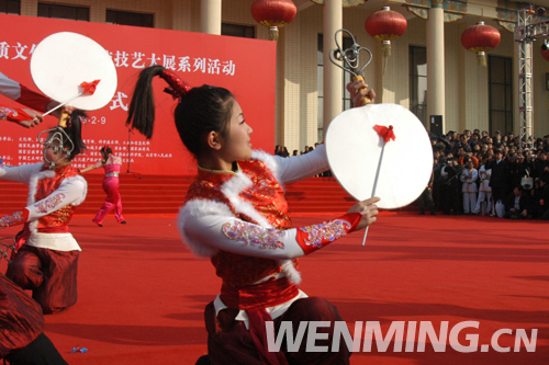 2月9日下午,中國非物質文化遺產傳統技藝大展開幕式在全國農業展覽館舉行。圖為開幕式上的太平鼓表演。 中國文明網 王嘯 攝