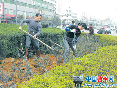 昨日,在贛州市八一四大道,幾名園林職工在忙著打穴準備添種花木,以達到更好的綠化效果。時下正是植樹的最佳季節,記者在贛州中心城區看到,許多路段都有園林職工勞動的身影。