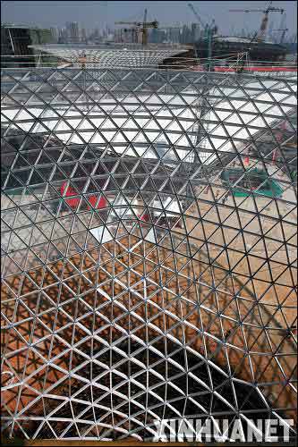 4月30日,世博園區(qū)內(nèi)最大的單體工程——世博軸首批兩個透明圓錐狀“陽光谷”正式落成,世博軸頂棚膜結(jié)構(gòu)張拉同時啟動。