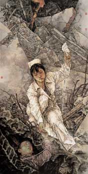 在“藝術北京2009”亮相的“1+1慈善展——汶川地震一周年藝術慈善特別行動”吸引了眾多觀眾的注意力。來自中央美院的19位入選國家重大歷史題材美術創作工程的藝術家的38件作品集體展出,共同為一周年后的汶川災區募款。圖為畢建勛參展作品《不能離開你》。