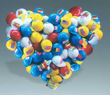 構思不同、表達多樣的100多件雕塑,從不同角度展現了地震中人性的堅強與抗爭。如燕山大學藝術學院教師吳新的浮雕作品《我們的畢業照》,展現的是一張老師缺席的畢業照,作者為地震中老師的犧牲精神所感動,并期望將這種感動傳達給觀眾。西安美術學院雕塑系教授周曉東的作品《茂汶蘋果》,雕刻了一個特殊的蘋果,裂了口的蘋果上描繪了重建后的家園圖。他說,是四川人都熟知的汶川和茂縣的土特產蘋果給了他表達的沖動。親自去過災區的周曉東深深地體會到地震中人們的心理障礙,“許多人根本無法面對親人的忽然離去!彼运敢庥脴酚^的蘋果去感染人的情緒,讓他們感受到生的希望,因為,比自然災難更可怕的是人的絕望。天津美術學院學生韓帥、宋曉燕、李鵬共同創作的作品《關愛》,將貼有各國國旗的五彩安全帽組合成心形,既使觀眾重溫了國際救援愛心行動帶來的希望與感動,也不禁為“80后”藝術家的巧妙構思而叫好。