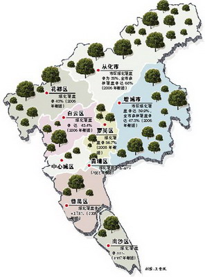 廣州綠化率數(shù)據與現(xiàn)實“貨不對板”的感覺還來源于廣州綠地資源分布不均衡。據廣州市林業(yè)局的調查,廣州北部山區(qū)林木參天,植物種類占全市總數(shù)的85%以上。