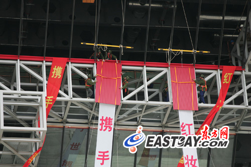 5月25日下午3時,上海世博會中國國家館外立面開始“上紅”。據了解,外立面掛裝過程將歷時兩個月,至7月25日,中國館將“穿”上大氣、經典的中國紅“外衣”。
