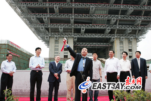 上海世博局副局長丁浩為中國國家館肌理紅板開掛發令