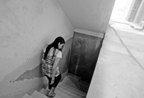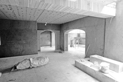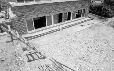 記者繞到后門(mén),看見(jiàn)門(mén)右側(cè)有一個(gè)樓梯。樓梯內(nèi)光線(xiàn)很暗,記者小心順著樓梯拾階而下。樓梯盡頭,光線(xiàn)突然由暗變明,一個(gè)約百平方米的地下室赫然呈現(xiàn)在眼前。地下室入口處砌著一個(gè)水泥臺(tái),兩側(cè)墻壁上裝著五扇玻璃窗。記者貓著腰走進(jìn)去,看到里面的房間一個(gè)連著一個(gè),別有洞天。走到門(mén)口左側(cè),有一個(gè)類(lèi)似于吧臺(tái)形狀的弧形建筑。這大概是業(yè)主想要在地下室開(kāi)PARTY用的吧。