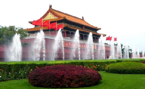 2009年7月27日,北京天安門前的噴泉正在進行調試,各種新穎造型的噴泉景觀交替變幻、令人陶醉,迎接建國60周年的到來。