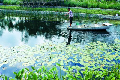 日前,世博園區(qū)內又一大型“綠肺”——后灘公園基本建成。昨天,記者走進這約14公頃的公園,一股鄉(xiāng)村氣息撲面而來,一口口水塘邊種滿了水稻、慈姑、茭白、菖蒲等農作物和水生植物。其實,一口口水塘是不同功能的水質凈化池,黃浦江水流入公園后,完全依靠20多種水生植物凈化,從而由五類水變成三類水,用來澆灌后灘公園和世博公園的綠化