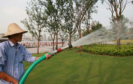 一位園林工人正在世博公園里澆灌草木。新華社記者 任瓏 攝影報道