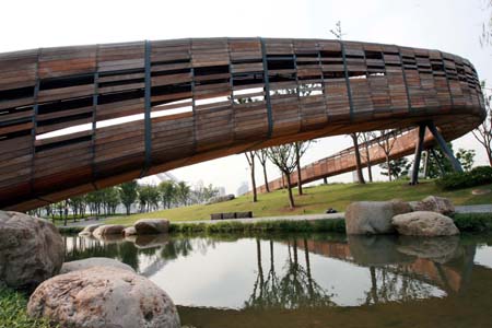 世博公園雖然是由一家荷蘭公司規劃設計,有著西方園林簡潔、大氣的特點,但重現“上海灘”景觀、將江景“借”入公園,大量運用透水磚和地坪,橋梁和道路多用材等手法,仍透出濃厚的東方園林思維,營造出人與自然親近融合、“天人合一”的意境。