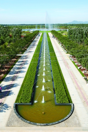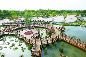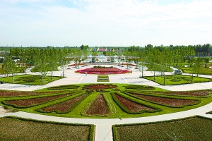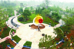 京華園以植物造景為主,栽有各類苗木70多個品種2000多株,月季、菊花8000多株,其他花卉60多個品種26000多株,草坪900平方米。園內地形高低起伏,層林疊翠,除菊花和月季的栽植貫穿全園外,還有抽象的月季花形的鋼橋,以曲線的柔美,營造似穿行于花瓣中的意境,菊花形流水將菊花弧線的自然美與水流的靈動巧妙地結合在一起。