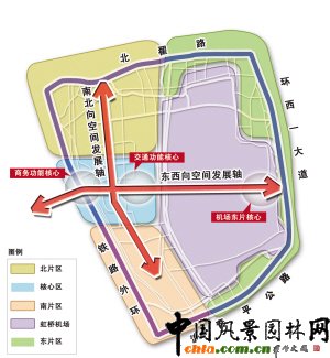 而根據現有規劃,虹橋商務區26.3平方公里的總體布局是“一環、兩軸、三核、五區”。一環,指外圍由公共綠地、防護綠地、河流水域等形成的生態綠環,是虹橋商務區生態品質的保障。兩軸,指東西向空間發展軸和南北向空間發展軸,為這一區域發展的基本構架。三核,指由東西向空間發展軸串聯的三個重要功能核心。其中,交通功能核心由虹橋機場西航站樓、鐵路虹橋站、軌道交通、公交巴士站和地下停車庫等構成的樞紐功能綜合體,是虹橋商務區最重要的功能構成要素和服務長三角的動力之源;商務功能核心則位于交通功能核心西側,主要布局與樞紐功能密切相關、服務輻射長三角的商務辦公、文化、交流功能,是虹橋商務區建設的活力之源;機場東片核心是指虹橋機場航站樓及周邊商業、商務、行政辦公等形成的片區功能核心,帶動機場東片的改造和更新,完善加強樞紐服務功能。五區,指按照功能布局形成的核心區、虹橋機場、北片區、南片區、東片區等五個不同功能板塊。