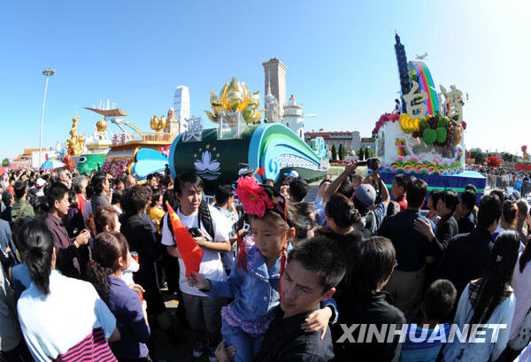 10月3日,游客在天安門廣場的彩車前拍照留影。