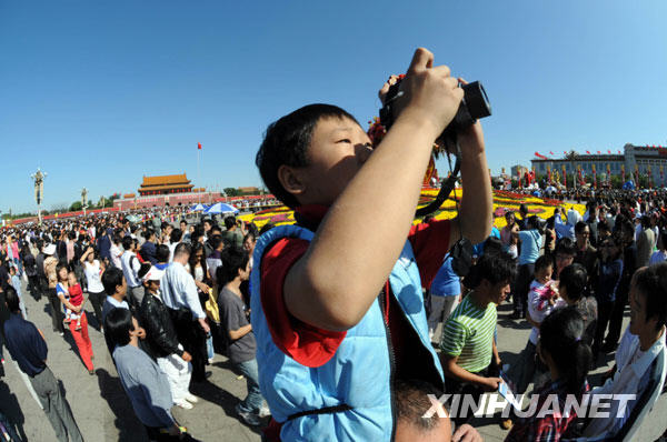 10月3日,一名小男孩騎在大人肩上拍攝天安門廣場的壯觀美景。新華社記者 楊宗友 攝