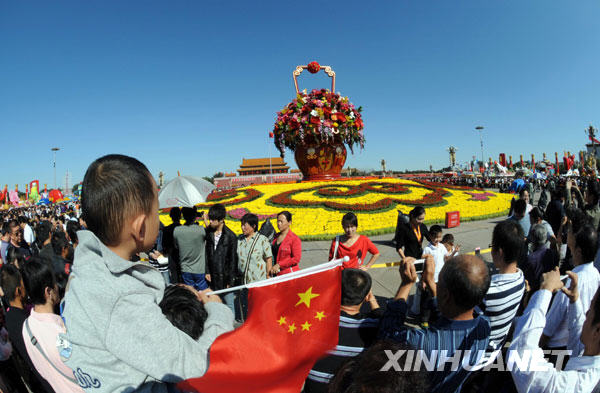 10月3日,游客紛紛在天安門廣場的大型花壇前拍照留念。新華社記者 楊宗友 攝