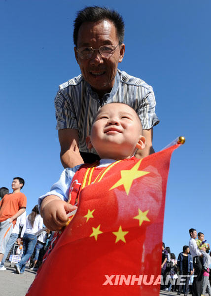 10月3日,一名老人帶著孫子在天安門廣場游玩。新華社記者 楊宗友 攝