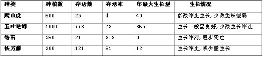 這些問題的解決是實施高架道路垂直綠化的關鍵。因高架道路承重能力的要求, 槽內栽植土勢必淺薄, 而川流不息的車輛排放出大量的廢氣及酷暑當頭、寒風盡吹的惡劣土地條件也給植物品種的選擇增加了局限性。因此, 高架道路兩側種植的植物應具備以下特點: