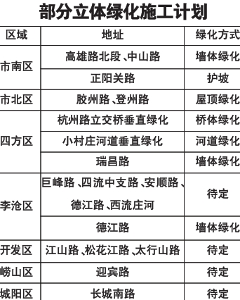 據(jù)介紹,根據(jù)規(guī)劃,在明年年底前,本市還將實(shí)施市南區(qū)正陽關(guān)路等20余處立體綠化項(xiàng)目。