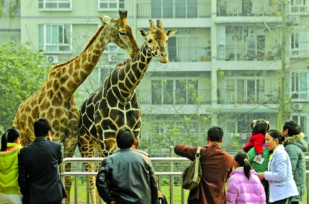 市民在重慶動物園觀賞長頸鹿