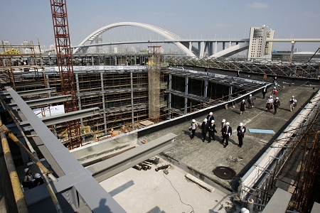 昨天,在已經(jīng)完成主體結(jié)構(gòu)施工的法國館,巨大的屋頂正在鋪設(shè)防水層,法國館方面透露,整個法國館垂直花園包括正反兩面,正面將種植黃楊等古典式花圃常見的綠色植物,背面則會有精心搭配的多色調(diào)、多種類枝組合;▓@正對餐廳的部分將設(shè)計成一個種有菠菜、西紅柿、辣椒和莓的迷你菜園。