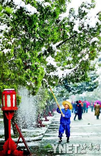 11月1日,北京市園林局發(fā)出《關(guān)于緊急處理雪天樹(shù)枝積雪的通知》,要求各區(qū)園林綠化主管部門(mén)全面啟動(dòng)雪天應(yīng)急預(yù)案,安排全體職工對(duì)轄區(qū)內(nèi)樹(shù)木特別是臨街樹(shù)木、古樹(shù)進(jìn)行清雪處理。