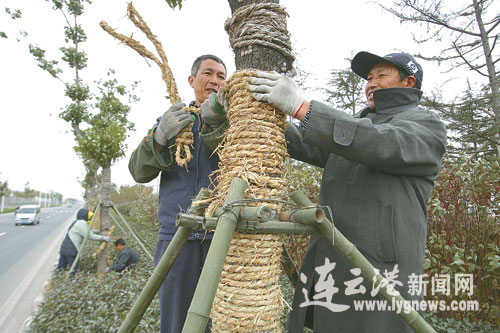 圖文:連云港園林工人為市區(qū)樹木穿棉衣