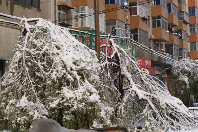 11月11日,受強冷空氣影響,我市遭遇凍雨、大雪災害天氣,市區各游園、廣場及道路樹大量出現倒伏、斷枝等現象,導致部分交通受阻,通信、電力中斷,給群眾生產、生活帶來不利影響,經濟損失和生態損失巨大。據不完全統計,市區游園、廣場和道路約90%以上的喬木出現斷枝、倒伏、斷頭、劈裂等現象,直接經濟損失達2000多萬元。
