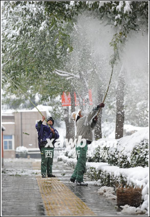 為了防止積雪再次損害樹木,市容園林局綠化處昨日專門安排綠化養護工人100多人上街給樹掃雪。昨天上午9點,全市100余名綠化工作人員手持竿對二環、三環、浐灞路等主要路段積雪較厚的灌、喬木進行掃雪。記者 周瑞