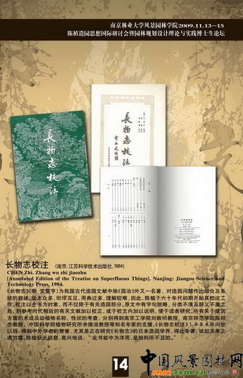 中國風(fēng)景園林網(wǎng) 2009年11月14日,陳植造園思想研討會(huì)暨江蘇省園林規(guī)劃設(shè)計(jì)理論與實(shí)踐博士生論壇在南京林業(yè)大學(xué)召開。此次會(huì)議的主題是"傳承·交融"。江蘇省建設(shè)廳、教育廳領(lǐng)導(dǎo)和來自國內(nèi)外的專家學(xué)者及風(fēng)景園林院校師生共計(jì)500余位參加了此次會(huì)議。
