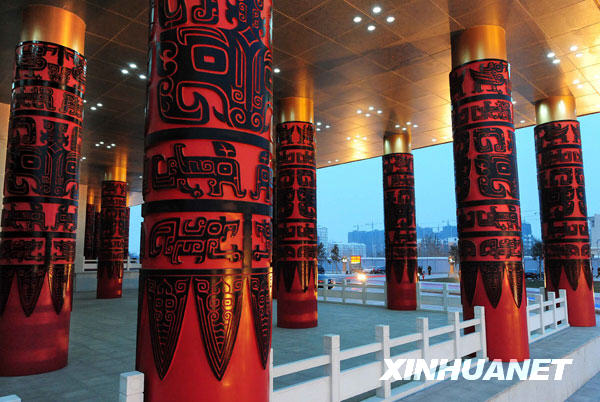 在中國文字博物館外廊的雕柱上,紅黑相間的饕餮紋圖案構成了殷商宮殿建筑形象的基本要素。