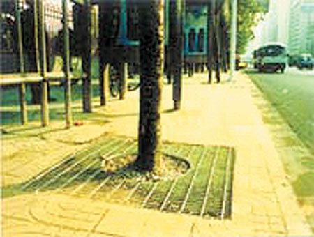 用透水混凝土來治黃土裸露效果固然好,但從景觀角度考慮并不是很美觀,所以“三中路”改造中大部分行道樹的樹池上,鋪上了一層高分子玻璃鋼材料或復(fù)合型聚塑材料,這兩種新材料在透水性、透氣性性能上十分優(yōu)越。且網(wǎng)格狀的設(shè)置,從外觀看非常漂亮。最主要的是其有著透水混凝土不具備的優(yōu)勢,有一定的伸縮性。行道樹在生長過程中,樹根經(jīng)常會把水泥或泥塊頂起來,從而影響景觀,而高分子玻璃鋼材料或復(fù)合型聚塑材料能承受一定的彎曲。