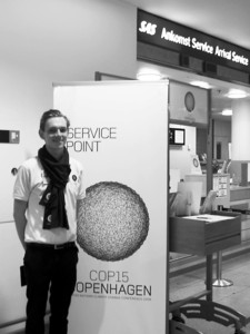“你們好!是從中國來的嗎? ”12月5日晚上,記者一行從德國法蘭克福轉機,抵達哥本哈根機場。一路上,聽到的都是英語、德國、丹麥語。突然有人用普通話跟我們打招呼,不覺有些驚訝。定睛一看,竟然是個高高瘦瘦、黃頭發的年輕人。只見他身穿印有“COP 15”標志的白色T恤和藍色圍巾,原來是大會的志愿者馬茨。