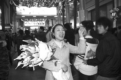 24日晚,光谷步行街廣場上一名女青年叫賣玫瑰花。 記者 楊濤 攝
