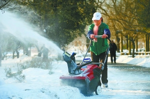 昨天下午,北京植物園園林職工正在用一種新型清雪機清除公園內(nèi)人行道上的積雪。據(jù)介紹,該清雪機是本市首次使用,比人工清雪效率提高20倍,雪后兩小時就能把園區(qū)人行道積雪清理完畢,而且還可直接把雪噴灑在十幾米范圍的綠地內(nèi),直接作為綠化用水。